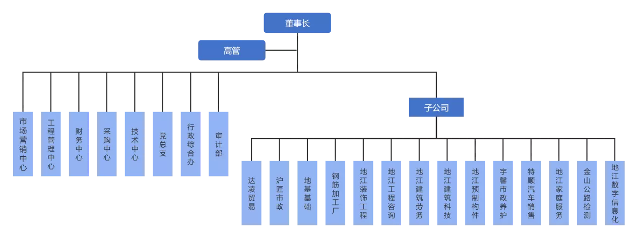 公司旗下拥有12家全资或控股子、分公司,分别为上海市地江建筑科技有限公司(高新技术企业)、上海达凌贸易有限公司、上海宇馨市政养护有限公司、上海市沪匠市政工程有限公司、上海地江工程咨询有限公司、上海地江建筑劳务有限公司、上海特顺汽车销售服务有限公司、上海地江预制构件有限公司、上海地江家庭服务有限公司、装饰分公司、钢筋加工厂、地基基础分公司。