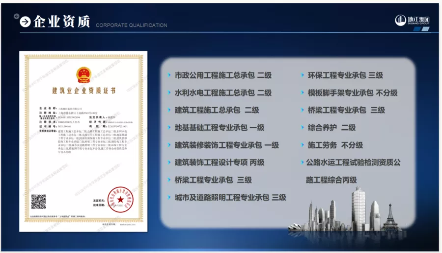 公司主要从事市政、公路、房屋建筑、水利等工程施工,目前拥有市政、公路、水利、建筑施工总承包二级以及地基基础、建筑装饰装修专业承包一级等资质。
